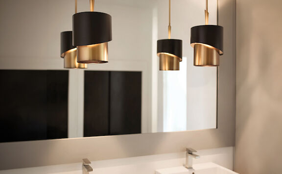 Add excitement to familiar flat, ambient bathroom lighting with an asymmetrical pendant or two. A sophisticated way to frame any vanity mirror, these unconventional fixtures offer dynamic illumination for a more glamorous experience.